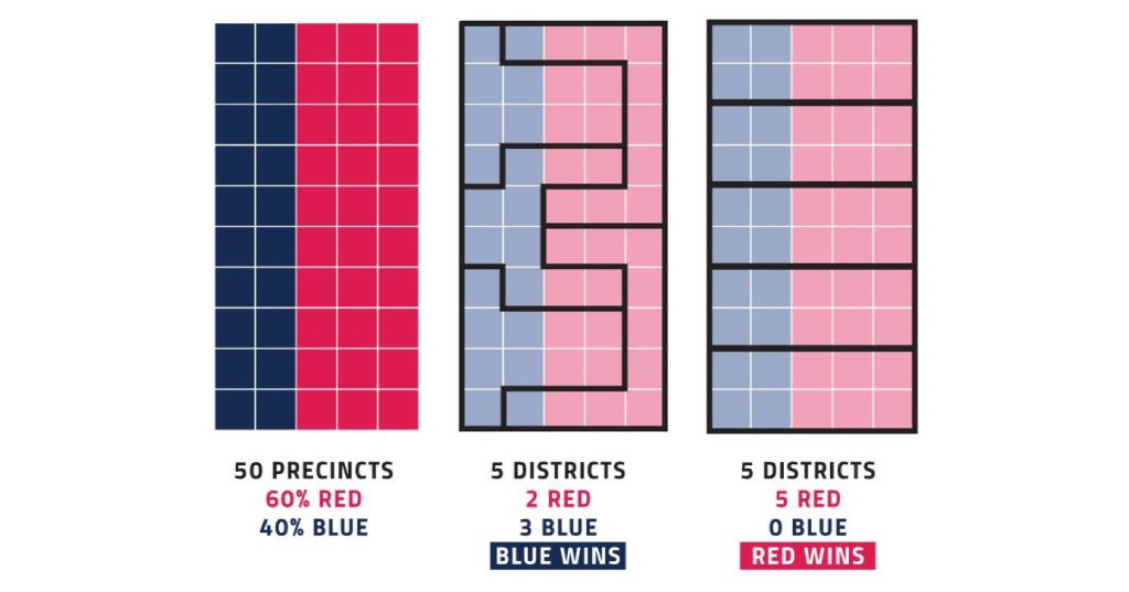 Every ten years in the United States, political figures from each state come together to redraw the boundaries of their congressional and state legislative districts. The shape of each district does not remain consistent across state lines; politicians often explain this away by stating that the districts can’t be drawn into constant shape because of how very few of the states in the U.S. are perfect squares or rectangles. The people that draw the lines vary from state to state. The way these districts are drawn are crucial because they can have huge impacts on elections, for both voters and politicians. The maps can determine the winner of elections and therefore political distribution. This can affect how communities are represented, and how accurately they are represented. This aforementioned influence of gerrymandering proves to be a tantalizing opportunity for politicians to manipulate district lines for political gain. Although there are several political sides to gerrymandering, simple mathematics is at the heart of it for politicians. To be more specific, the mathematics behind gerrymandering comes down to two concepts: Distribution and something called the “efficiency gap”. Imagine you have a state that is composed of 4 districts and has 200 total voters. 100 of those voters align with the values of party X, and the other 100 voters align with the values of party Y. In a world with absolutely equal distribution of voters, there would be an equal amount of distribution (because of how the districts are drawn fairly) for each party, like this: